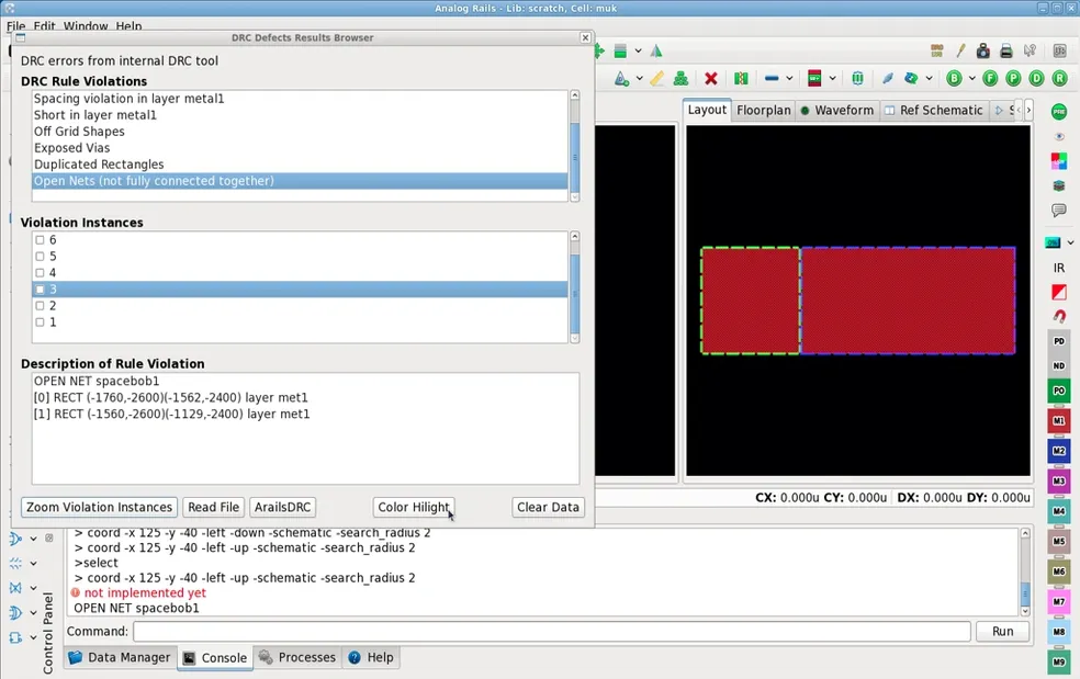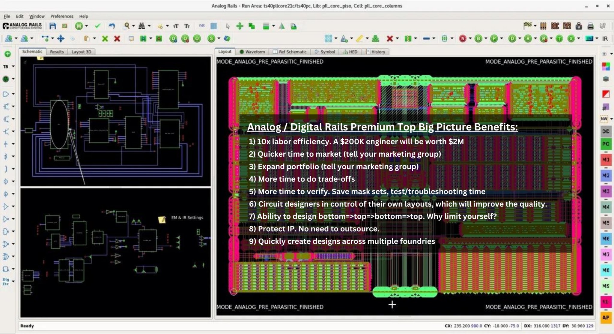 Built on the industry standard Open Access (OA) from scratch without legacy code. Analog On Rails Basic uses the same database as VXL. Never have a DRC or LVS violation. Cross probing and backannotation always. Infinite supply of multithreaded co-simulation licenses.